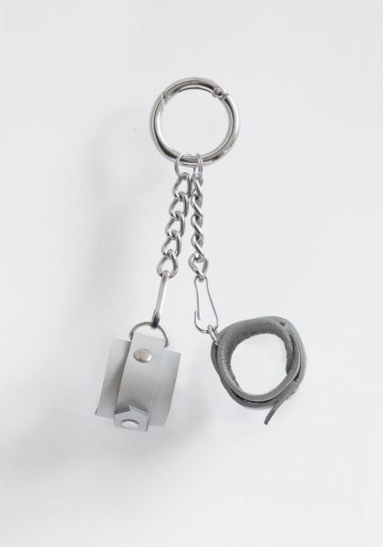 Мини-наручники из натуральной кожи растительного дубления, украшены хольнитенами (заклепками). Каждый наручник крепится к основному кольцу-карабину цепочкой и мини-карабином, поэтому можно носить только один наручник, а второй — подарить своему партнеру в качестве символа.