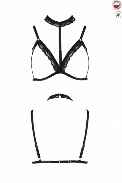 Роскошный и необычный бюстгальтер-стрепы с чокером! Полностью открывает грудь, красиво очерчивая ее мягкими ремнями, и добавляет сексуальности благодаря бретелям и чокеру с кружевом. Все детали регулируются, позволяя подогнать бюстгальтер по вашей фигуре.
