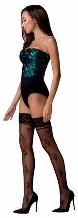 Элегантные чулки Passion ST119 3/4 черные, на ажурной силиконовой резинке, с цветочным декором и люрексовой нитью из шелковистого и эластичного материала выгодно подчеркивают стройность ножек. Кружевная подвязка с цветочным декором, скрывает самоподдерживающую резинку и визуально удлиняет ножку. Богатый дизайн с большим количеством цветочных элементов, дополненных серебряной люрексовой нитью, создает сказочный и романтичный образ. Чулки надежно прилегают к коже, максимально комфортны и отлично сочетаются с корсетами или кружевным бельем.