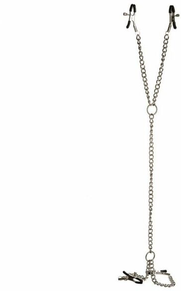 Набор черных металлических зажимов для сосков, каждый на металлической цепочке длиной 20 см, и прикрепленный зажим для клитора на металлической цепочке длиной 32 см.