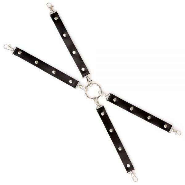 Четыре прочных ремня из натуральной кожи. На ремнях с обеих сторон расположены карабины, одна сторона пристегнута к кольцу, вторую сторону можно прикрепить например к наручника, оковам, ошейнику, на сколько хватит вашей фантазии что бы обездвижить партнера в понравившейся позе.