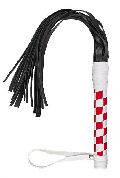 Флогер с отделкой белого и красного цвета. Необычный дизайн и приятный натуральный материал. Изготовлен из натуральной кожи, отделка на ручке из высококачественного заменителя кожи для удобства использования.