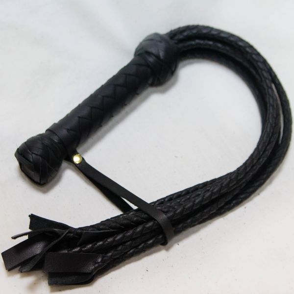Элегантный длинный флогер с витыми хвостами. Для еще большего эффекта от ваших БДСМ экспериментов каждый хвостик имеет раздвоенный кончик. Используйте этот флогер для легкого разогрева и для сильных ударов. Рукоятка флогера плотная, обвита натуральной кожей, хвосты изготовлены также из натуральной кожи, на ручке имеется петелька для более удобного использования аксессуара.