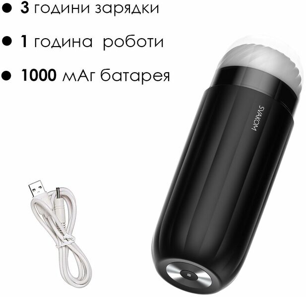 Интерактивный смарт-мастурбатор с вибрацией и вакуумом Svakom Sam Neo будет работать до 1 часа, после чего вам понадобится 3 часа на зарядку. Рукав свободно извлекается из корпуса и легко моется, потом его нужно вывернуть и тщательно просушить. В комплекте — штекерный кабель для зарядки и детальная инструкция пользователя.