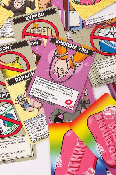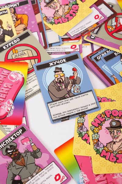 Коротко о правилах: Кто-то из игроков берёт на себя роль дилера. Он находит одну карту мыла в колоде и выдаёт её игроку с самой крутой задницей. После этого дилер перемешивает колоду и выдаёт по 5 случайных карт каждому игроку (или по 4, если вы играете вшестером). Оставшиеся карты нужно положить стопкой в центре стола рубашкой вверх - это колода. Игра начинается - игрок, которому было выдано отдельное мыло, ходит первым. Игроки ходят по очереди по часовой стрелке и в свой ход разыгрывают одну карту с руки (только одну). Эта карта отправляется в сброс (отдельная стопка карт, лежащих в открытую рядом с колодой), и после этого разыгрывается её эффект. Не нужно добирать в руку карты из колоды, если этого не сказано в разыгранной карте. Карты мыла разыгрываются, только если у вас больше нет никаких вариантов - вы роняете мыло, упс!