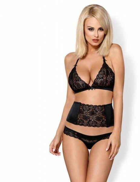 Сексуальный комплект нижнего белья состоящий с 3-х частей: бюста, пояса и трусиков. Мягкий бюстгальтер подчеркнет зону декольте регулируемые бретели позволят отрегулировать посадку бюста так, как Вам комфортно. Высокий и широкий пояс моделирует фигуру и скрывает недостатки. Сзади на поясе находиться эротичная шнуровка, которую можно утянуть и подогнать пояс по фигуре. Стринги имеют низкую посадку. Комплект красиво облегает фигуру, подчеркивает женские изгибы, делает ее изящной и утонченной.
