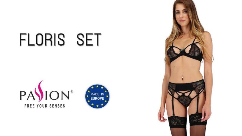 Предлагаем купить эротический комплект PASSION FLORIS SET чёрный из нежной микрофибры. Включает в себя 3 вещи. Бюстгальтер, трусики и пояс. Эксклюзивный дизайн комплекта подчёркивает все достоинства фигуры. Лиф выполнен из двухцветного кружева с оригинальными чёрными ремешками, прозрачность белья позволяет угадывать красоту и форму женской груди. Поясок с кружевными ставками умело делает талию ещё тоньше, маскируя малейшие недостатки. Дополняет ансамбль тоненькие трусики. Почувствуйте себя по-другому в комплекте Floris, чувственной, желанной и дерзкой!