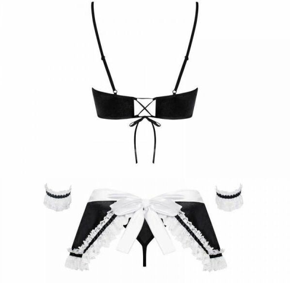 Эротичный костюм горничной придаст свежести вашим отношениям. В комплекте майка-топ, юбка, стринги и манжеты. Майка сзади имеет шнуровку, благодаря которой можно корректировать размер. Юбка в форме фартушка, завязывается сзади на сексуальный бант. Плотная качественная упаковка, внутри с бумагой и подарочной открыткой. Блестяще подойдёт для подарка, от которого любая девушка будет в восторге. Производитель Obsessive, давно зарекомендовал себя на просторах качественного белья и костюмов для игр и пользуется огромным спросом у гурманов и любителей прекрасного, красивого белья.