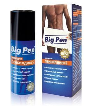 Увеличить размер пениса также легко, как, например, бицепсов. Для этого используется специальная методика - пенбилдинг™ (от слов «penis» и «building», т.е. дословно «построение пениса»). Это постепенное механическое растяжения пениса мужчины до желаемых размеров. За счет удлинения кровенаполнение полового органа значительно увеличивается во время эрекции. Член становится большим и упругим. Крем «Big Pen» – персональный «тренер» и помощник для занятий пенбилдингом. Разогревая кожу полового члена, он настраивает своего обладателя на спортивный лад и предстоящие упражнения. Средство разработано специально для максимального комфорта: комбинирует нежное и супердлительное скольжение масла и приятную упругость крема. Исключительный уровень комфорта и приятных ощущений сочетается с особенной структурой. «Tingle»-эффект является уникальным свойством «Big Pen». Это чувство покалывания и дрожи, которое возникает за счет быстрого проникновения активных компонентов и дает реальное ощущение происходящих изменений. Крем обогащен натуральными компонентами. Смесь экстрактов (каштан конский, гинко билоба, иглица шиповатая) эффективно укрепляет стенки кровеносных сосудов и улучшает кровообращение, делает соединительные ткани эластичными и легко растяжимыми. Южноамериканское «дерево потенции» муира пуама с древних времен используется в народной медицине в качестве средства, которое «то, что мягкое, делает твердым». Женьшень оказывает тонизирующее и стимулирующее действие. Природный афродизиак имбирь вызывает и усиливает половое влечение. Применение: ежедневно (в течение курса 10-14 дней) наносите крем на ствол и головку полового члена массирующими движениями до полного впитывания. После чего приступайте к специальным упражнениям. Длительность занятий пенбилдингом в среднем составляет 15-20 минут в день. Упражнения подробно описаны в инструкции, прилагаемой к крему «Big Pen».