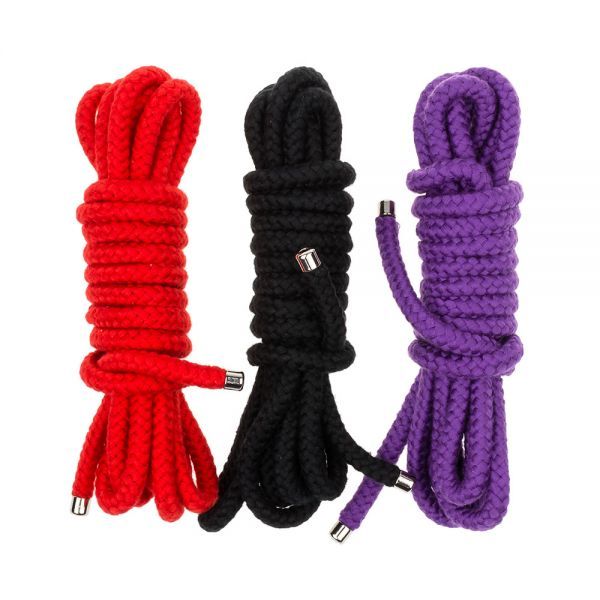 Мягкие и прочные веревки для бондажа изготовлены из безопасных материалов для удобства во время использования. Небольшая толщина веревки делает ее удобной для создания различных обвязок. Этот набор отлично подойдет для любителей ролевых игр, как для начинающих, так и для опытных пользователей. Связывайте своего партнера и лишайте его возможных действий. Откройте новое измерение вашей спальни используя все возможности веревок как для связывания так и для шибари. А разные цвета веревок только добавят изысканности вашему таинству.