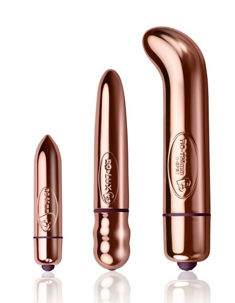 Чудесный комплект из трех вибраторов: самой мощной в мире односкоростной вибропули, гладкого мини-массажера с 10 скоростями для точечного воздействия на самые чувствительные зоны и вибратора специальной формы для стимуляции точки G. Купить набор вибраторов Rocks Off Rose Gold - это значит отправиться к вершинам удовольствия, не пропустив ни одной, даже самой потаенной, зоны удовольствия.