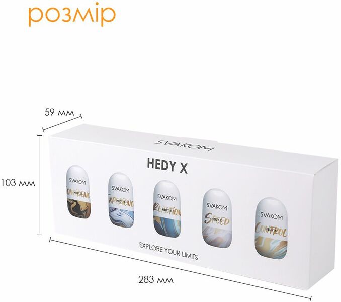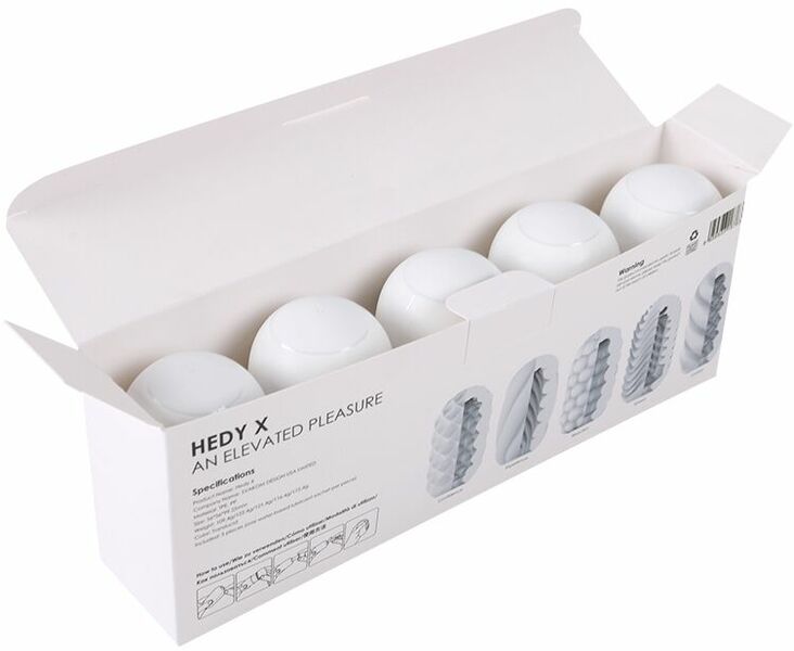 5 яиц, 5 уникальных текстур, 5 фантастических новых ощущений — предлагаем купить набор яиц мастурбаторов Svakom Hedy X- Mixed Textures, изготовленных из невероятно реалистичного материала. Спирали, ячейки, сферы, полосы и волны — все эти проработанные текстуры расположены внутри яиц и будут стимулировать каждый сантиметр пениса для впечатляющих оргазмов. Но и это еще не все! Каждое яйцо можно использовать с двух сторон, просто вывернув его, ведь наружная текстура каждого яйца тоже уникальна — еще больше впечатлений от одного набора. Упаковка служит отличной подставкой для сушки мастурбатора!