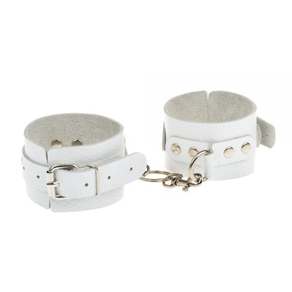 белые наручники с металлическими заклёпками. Изготовлены вручную из итальянской кожи самого высокого качества. Крепкие и мягкие, легко ограничат движения Вашего партнёра не причинив ему дискомфорта. Помогут достичь эффекта полного подчинения, так как можно легко соединить их с оковами или поводком.