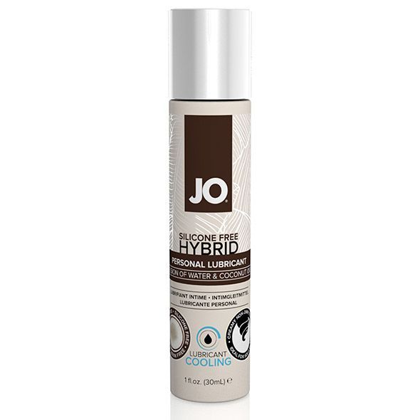 Лубрикант на комбинированной основе System JO SILICONE FREE HYBRID - COOLING с охлаждающим эффектом не содержащее силикона средство JO® HYBRID. Это интимный лубрикант, используемый в качестве дополнения к естественной смазке. Нежная гладкая текстура и изысканный аромат кокоса отлично дополнят атмосферу интимности и уединения. К тому же этот роскошный кремообразный белый лубрикант отлично подходит для трех видов ласк: самостоятельных, ласк в паре и/или с применением силиконовых игрушек.