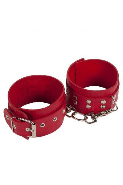 Кожаные оковы на ноги красного цвета. Красивый дизайн, ручная работа и кожа высочайшего качества не оставят никого равнодушным. Подкладка мягкая, также выполнена из кожи. Между собой соединяются прочными карабинами из металла. Длина 30 см, ширина 6 см, ремешок 35 см , регулируется на 15 см, расстояние между 9 см.