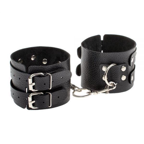 Широкие кожаные оковы из натуральной чёрной кожи. Помогут крепко зафиксировать Вашего партнёра не причиняя ему дискомфорта. Оковы соединяются между собой кольцом и карабинами, предусматривают возможность прикрепления фиксатора с наручниками. Ваша вторая половинка наверняка не сможет противостоять Вашим ласкам и вы вместе получите неземное удовольствие.