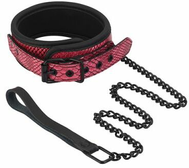 Комплект Collar & Leash с мягким удобным воротником, имитирующим кожу змеи. Воротник легко регулируется по размеру благодаря застежке-пряжке. Металлический поводок с прикрепленной петлей для запястья легко подсоединяется или отсоединяется с помощью клипсы.