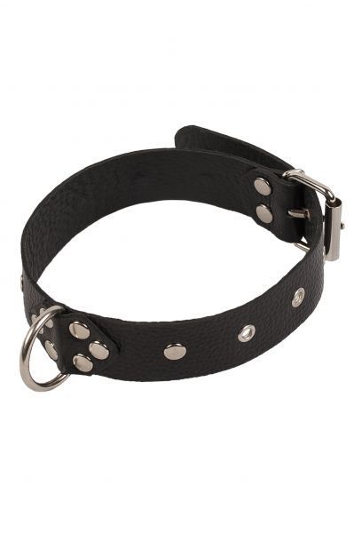 Чёрный ошейник из мягкой натуральной кожи. Украшен никелированной фурнитурой. Кольцо спереди позволяет прикрепить поводок или другой БДСМ аксессуар. На внутренней стороне ошейника нет металлических деталей, что позволяет носить его без дискомфорта длительное время. Эксперементируйте и наслаждайтесь! Длина 46 см,ширина 3 см, регулируется на 17 см
