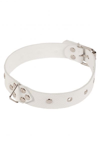 Ошейник из натуральной качественной кожи ручной работы. Классический дизайн. Мягкая подкладка не причиняет абсолютно никакого дискомфорта при длительном ношении. На аксессуаре прочное металлическое крепление оригинальной формы, к которому при желании можно пристегнуть, поводок или соединить его с другими видами бондажа. Цвет белый. Длина 46 см, ширина 3 см, регулируется на 17 см