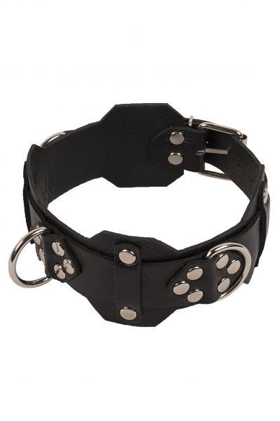 Чёрный брутальный ошейник из натуральной кожи. Несмотря на грубый вид, внутри ошейник изготовлен из мягкой кожи, совершенно не причиняет дискомфорт при носке. При изготовлении ошейника используется фурнитура с никелированным покрытием. Три D-образных кольца позволят присоединить поводок или другой БДСМ аксессуар на карабине. Прекрасно подойдёт как для начинающих любителей игр, так и для опытных ценителей. Длина 45 см , ширина 6 см в широком месте, в узком 4 см, регулируется на 10 см