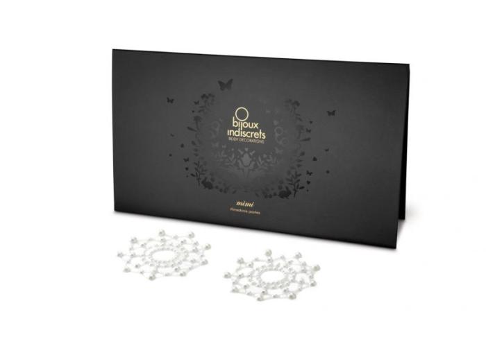 Bijoux Indiscrets MiMi - игривое и очень необычное украшение для груди сделает ее еще более сексуальной и пленительной. Композиция из стразов представляет собой парные аксессуары, составленные из кристаллов жемчужного цвета. Их следует наклеить таким образом, чтобы сосок оказался в центре окружности. Кристаллы легко крепятся с помощью самоклеящейся основы, что делает их невероятно удобными в использовании. Украшения предназначены для одноразового использования, однако если пользоваться ими аккуратно, многоразовое применение становится возможным. Просто нанесите на основу капельку клея для ресниц (только для наружного использования!) перед тем, как прикрепить украшения к коже.