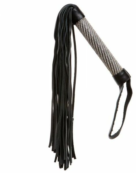 Черная плеть с рукоятью, окутанной сверкающими стразами, выглядит сексуально и завораживающе в руках госпожи.