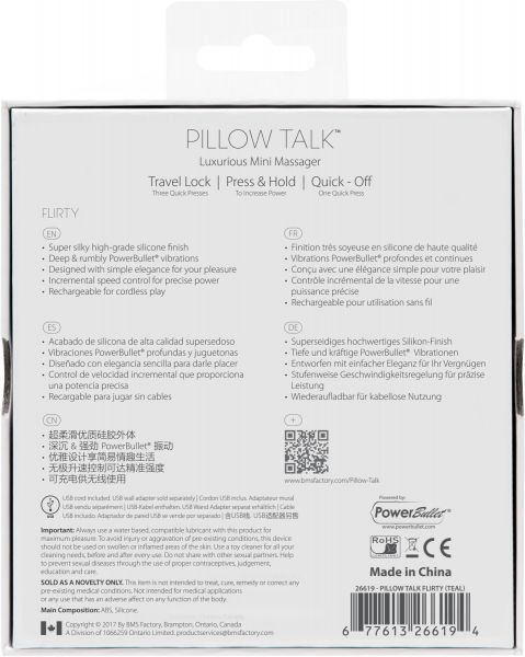 Маленький шедевр коллекции Pillow Talk - мини-вибратор Flirty. Небольшой и гибкий, покрытый шелковистым силиконом и с двумя бороздками по бокам, он просто создан для бесконечных сладких игр с самыми чувствительными точками. А кристалл Swarovski, украшающий рукоятку, делает его внешний вид идеально завершенным. Просто нажмите на кристалл, и наслаждайтесь! Сначала вибратор включается на минимальном уровне, но при удержании кнопки интенсивность вибрации возрастает вплоть до очень мощной, которая способна удивить даже самых искушенных. Чтобы вернуться к минимальным настройкам, нужно коротким нажатием выключить, а затем включить вибратор. Работает целых 3 часа без перерыва! После чего его можно подзарядить, и снова предаваться удовольствиям. Зарядный порт расположен на рукоятке и практически не заметен, обозначен буквами DC.