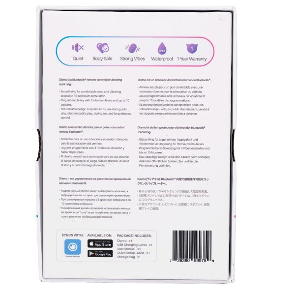 Внешне Lovense Diamo Cock Ring похоже на обычное эрекционное кольцо — петля для члена и виброэлемент в отростке, но это не совсем так. Кольцо достаточно широкое — в диаметре 4,5 см, гибкое, но практически не растягивается. Поэтому надеть его можно на член в неэрегированном состоянии или если диаметр эрегированного члена меньше диаметра кольца. Получается, кольцо служит больше для фиксации виброэлемента на члене, но за счет того, что оно очень плотное — хорошо передает вибрацию виброэлемента на всю окружность члена и способствует таким образом лучшему возбуждению и эрекции. Стойкая эрекция, фантастически мощные оргазмы и повышенная сексуальная выносливость — то, что вы получите, используя смарт кольцо-насадку Lovense Diamo Cock Ring! Попробуй отправится с ним на свидание или в кино, и насладись вибрациями в самый неожиданный момент! Управлять можно как самостоятельно, так и передав игру в руки партнерши или партнера.