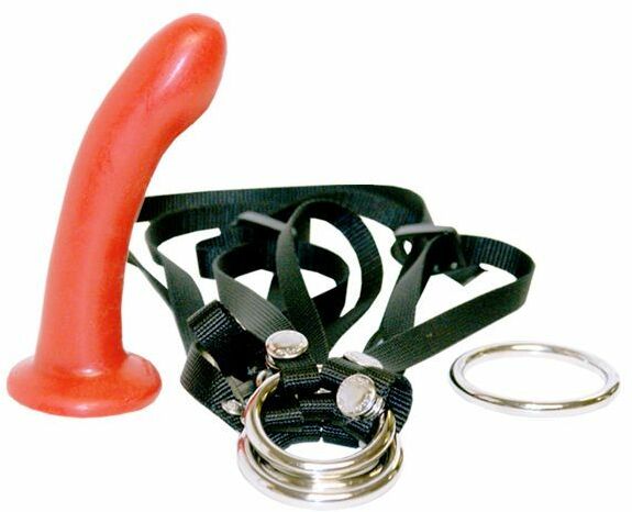 В комплекте идет красный силиконовый фаллоимитатор длиной 14 см и диаметром 3,3 см. Кроме того, можно использовать любой другой дилдо с расширяющимся основанием.