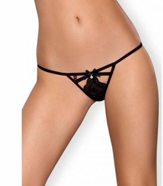 Аккуратные трусики-стринги с цветочным узором спереди украшенные милым атласным бантиком и сверкающими камушками. Производитель Obsessive, давно зарекомендовал себя на просторах качественного белья и костюмов для игр и пользуется огромным спросом у гурманов и любителей прекрасного, красивого белья.