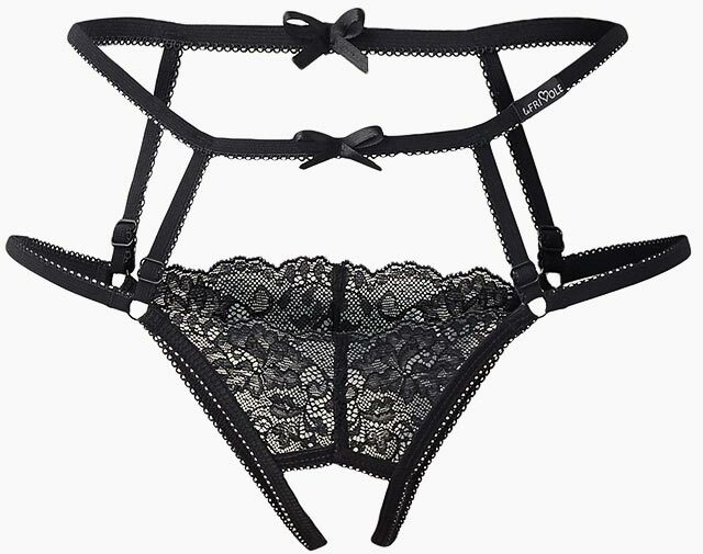 Кружева, атласные банты и узкие черные ленты на бедрах – эта модель с доступом выглядит в высшей степени эротично. Дополнительную пикантность ей придает вырез на задней части. Высокая талия подчеркивает красоту фигуры и делает ее визуально стройнее. Трусики позволяют воплотить в жизнь любые сексуальные фантазии, причем, для этого их не нужно даже снимать.