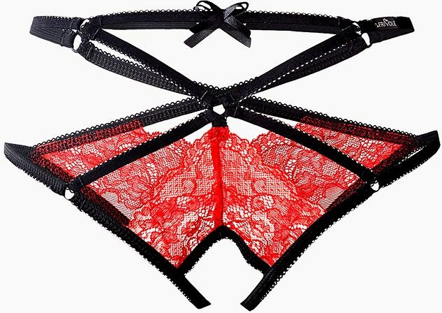 Трусики с доступом из полупрозрачного кружева и узких черных лент – прямой путь к сердцу мужчины. Они будят желание, дразнят, увлекают, кружат голову и подстегивают воображение. Сложносочиненное пересечение лент с акцентом на талии делает фигуру изящнее. Соблазн – вот слово, которое в полной мере характеризует эту модель.