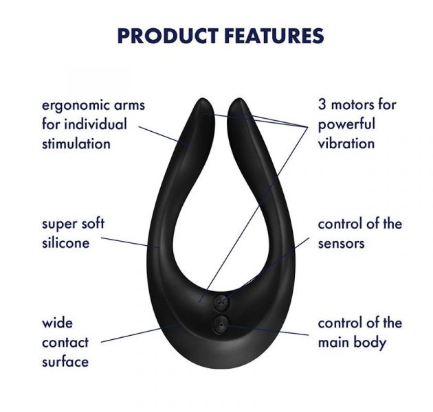 Вибратор довольно необычной формы, и именно благодаря ей у него такие широкие возможности использования. Вибратор отлично подходит для стимуляции клитора, точки G и других эрогенных зон - как самостоятельной, так и прямо во время секса. И, конечно, мужчина тоже не останется обделенным, так как этот вибратор будет воздействовать на самые чувствительные точки пениса и яичек. Кроме того, вибратор можно использовать в качестве необычного зажима для сосков. Обратите внимание: вибратор Satisfyer Endless Joy немного отличается по форме: отростки более узкие и идеально подходят для целенаправленной стимуляции, а корпус немного более тонкий, что открывает максимальный простор для фантазии. Кнопки в этой модели расположены максимально близко друг к другу для легкого управления. Подробные иллюстрации способов использования можно найти в инструкции к вибратору.