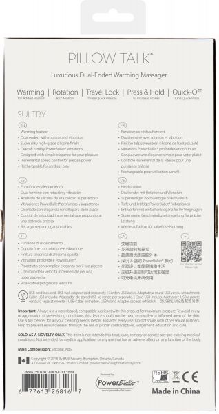 Предлагаем купить вибромассажер PILLOW TALK - Sultry Pink — роскошный массажер улучшенной формы с функцией нагрева и шикарным украшением — настоящим кристаллом Swarovski. Элегантный дизайн, удобное управление и двойное использование (вибрация головки + ротация ручки)  — этот вибромассажер создан для наивысшего удовольствия.