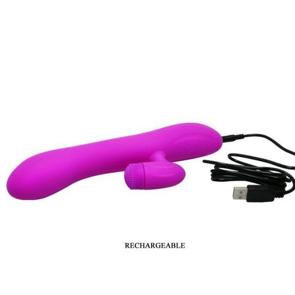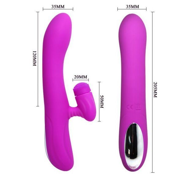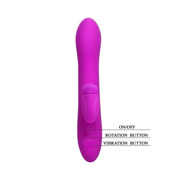 Силиконовый вибратор c клиторальным отростком с рельефной поверхностью в виде мягких отросточков.Имеет 7 режимов вибрации и 4 режима ротации клиторального стимулятора, лёгкое управление при помощи кнопок в основании.Имеет два моторчика.