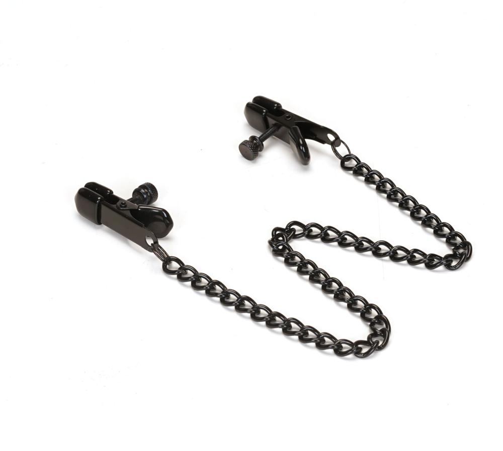 - Зажимы на цепочке для сосков. Оснащены силиконовыми накладками, чтобы не травмировать нежную кожу, но при этом позволяют довольно сильно сжимать соски благодаря винтам. Общая длина (зажимы + цепочка): 43 см.